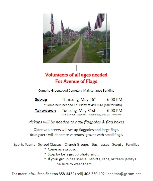 Help set up flags for the Avenue of flags at the cemetery on May 26th at 6:00 p.m. Any help is appreciated.