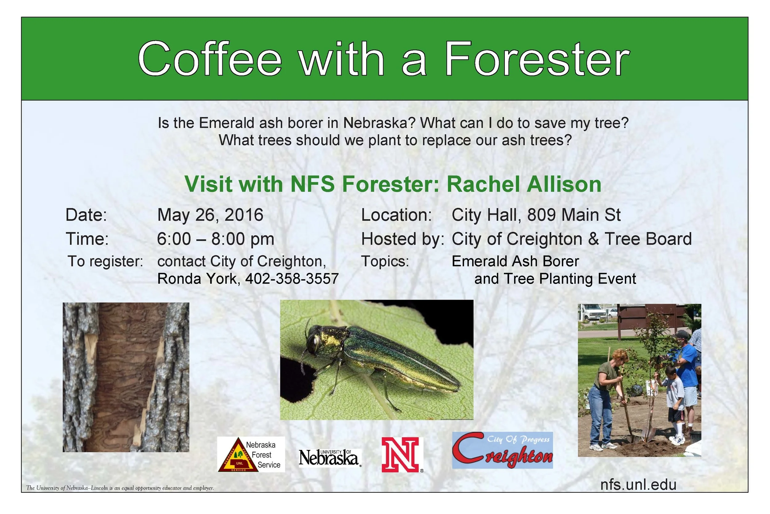 Is the Emerald ash borer in Nebraska? What can I do to save my tree? What trees should we plant to replace our ash trees? Find out on Thursday, May 26th with a visit from NFS Forester, Rachel Allison. The workshop will take place at the City Hall on Thursday from 6-8pm. To wrap up the even the group will move on to Bruce Park to plant two shade trees. Please call to register for the workshop by contacting Ronda York at the City of Creighton at 358-3557.